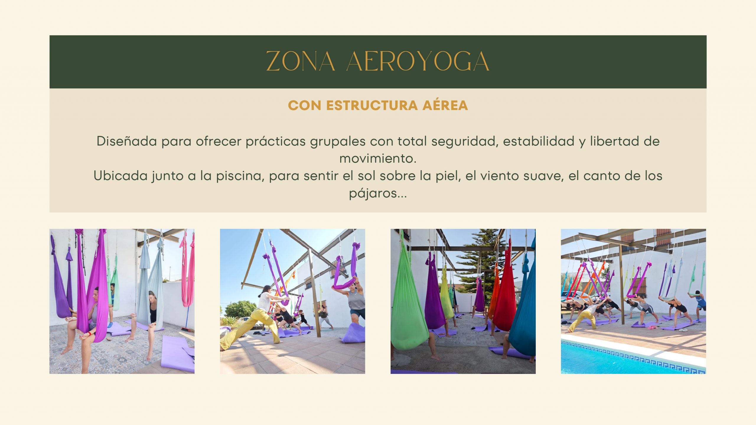 Con estructura de aeroyoga junto a la piscina, para trabajar el cuerpo de forma segura y consciente.